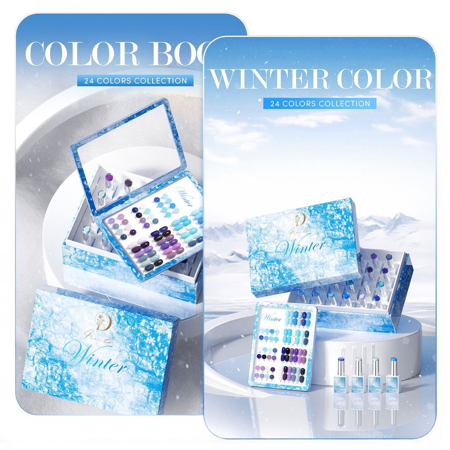 This winter collection captures the beauty of the winter season with 24 elegant gel polish colors. Our winter collection features cool, sophisticated tones perfect for the season – from icy blues and frosty silvers to deep jewel tones and classic holiday reds. The winter collection provides every shade you need for creating beautiful winter-inspired nail designs.